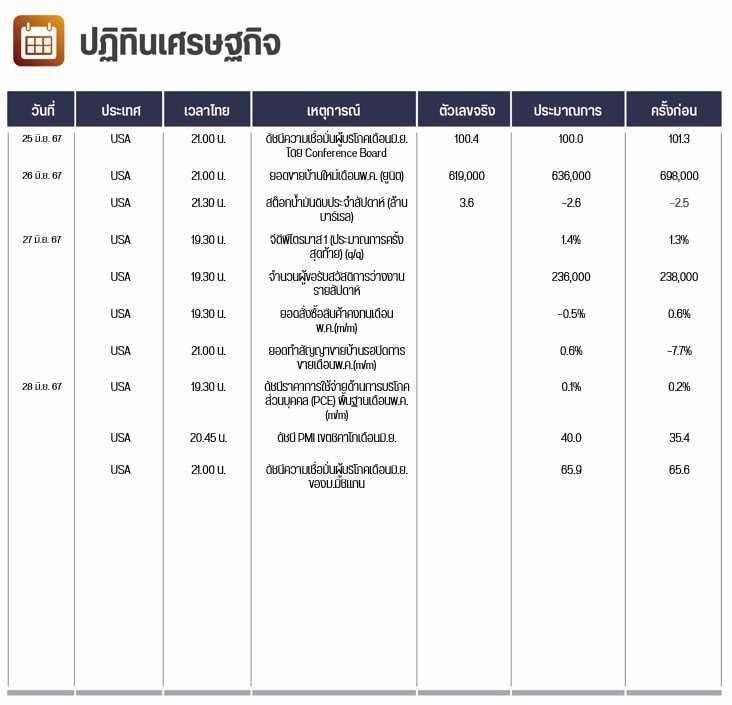 คืนนี้สหรัฐจะเปิดเผยจีดีพีไตรมาส 1 (ประมาณการครั้งสุดท้าย) ตลาดคาดว่าจะขยายตัว 1.4% จากที่ขยายตัว 1.3% ในการประมาณการครั้งก่อน จำนวนผู้ขอรับสวัสดิการว่างงานรายสัปดาห์ ยอดสั่งซื้อสินค้าคงทนเดือนพ.ค. และยอดทำสัญญาขายบ้านรอปิดการขายเดือนพ.ค.